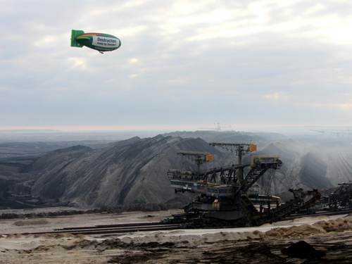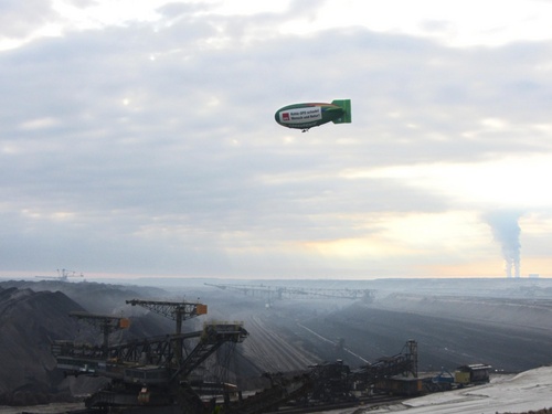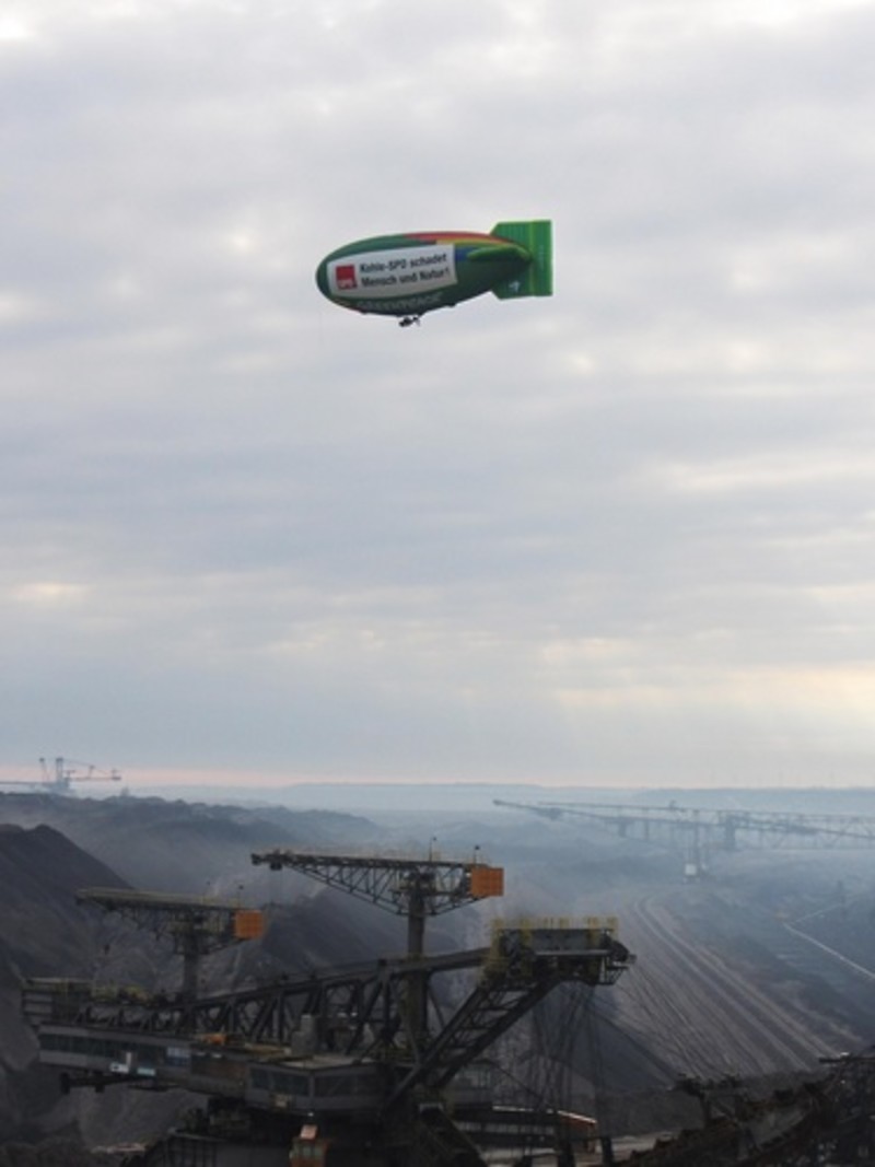 Mit einem vierzig Meter langen Zeppelin hat Greenpeace über dem Tagebau Welzow-Süd gegen die kohlefreundliche Politik der brandenburgischen SPD protestiert. Wenige Tage bevor Betroffene und Landesbehörden den neuen Braunkohletagebau Welzow-Süd II erörtern, flogen zwei Aktivisten mit dem Zeppelin über den Lausitzer Tagebau Welzow-Süd I. Auf dem Zeppelin prangte ein Banner mit der Inschrift „Kohle-SPD schadet Mensch und Natur“. Ministerpräsident Matthias Platzeck (SPD) unterstützt bislang die Pläne von Vattenfall für insgesamt fünf neue Braunkohletagebaue. „Wenn Platzeck diesen Tagebau genehmigt, macht er den Weg frei für weitere vierzig Jahre dreckiger Braunkohleverstromung. Damit schafft er einen gefährlichen Präzedenzfall für eine verkehrte Energiepolitik“, sagt Greenpeace-Energieexperte Gerald Neubauer.