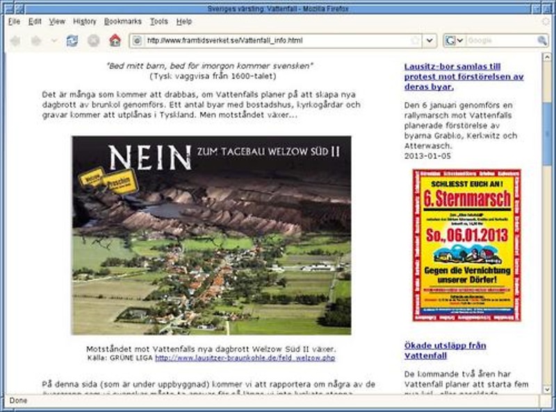 Sympathieäußerungen und Unterstützung für die Einwohner der von Abbaggerung bedrohten Dörfer in der Lausitz haben die Landtagsabgeordnete Monika Schulz-Höpfner zu Beginn des neuen Jahres aus Schweden erreicht. Doris Norrgård Almström, Lars Almström und Gleichgesinnte engagieren sich für Klima- und Umweltfragen. Unter www.framtidsverket.se informieren sie jetzt auch die schwedische Öffentlichkeit über die Aktivitäten der von Zerstörung bedrohten Dörfer in der Lausitz.