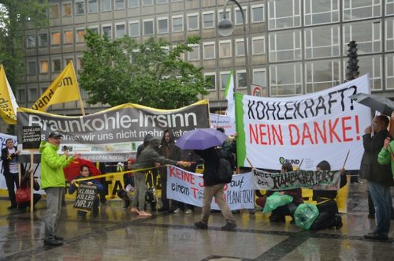 „Die Braukohleindustrie macht ihre Profite auf der Grundlage eines völlig veralteten Bergrechts, das die demokratischen Rechte der Bürgerinnen und Bürger noch immer mit Füßen tritt und faktisch Enteignungen ganzer Dorfgemeinschaften gegen ihren Willen ermöglicht“, sagte Adrian-Elias Rinnert vom Aktionsbündnis „Strukturwandel jetzt – kein Nochten 2“, als Vertreter der Lausitz auf der Protestaktion gestern in Köln. Anlässlich des Braunkohlentags protestieren Betroffene und Initiativen aus allen großen deutschen Braunkohlerevieren gemeinsam mit Verbänden gegen die Versuche der Braunkohlelobby, die umfangreiche Nutzung des klimaschädlichsten und schmutzigsten Energieträgers für weitere Jahrzehnte in Deutschland fortzuschreiben. Unter dem Motto „Den Braunkohle-Irrsinn können wir uns nicht mehr leisten!“ bilden sie vor dem Tagungsgebäude eine Menschenkette und umzingeln mit einem gelben Band, als Zeichen der Vernetzung des Braunkohleprotests und der Solidarität untereinander, symbolisch den Braunkohlentag in der Kölner Innenstadt.