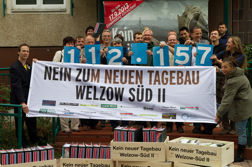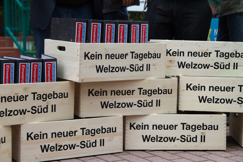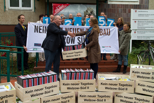 Gegen den vom Vattenfall-Konzern geplanten Braunkohlentagebau Welzow Süd II nahe Cottbus wurden heute 112 157 Einwendungen aus der Lausitz und ganz Deutschland an die zuständige Planungsbehörde übergeben. Damit hat sich die Zahl der Einwendungen im Vergleich zur Öffentlichkeitsbeteiligung beim ersten Planentwurf erheblich gesteigert. Ein breites Bündnis aus Betroffenen, Bürgerinitiativen, Umweltorganisationen und Verbänden hatten dazu aufgerufen, im Planverfahren gegen das Vorhaben des schwedischen Staatskonzernes Widerspruch einzulegen. Die beteiligten Verbände kritisieren zugleich Manipulationen bei der Öffentlichkeitsbeteiligung. Ein Teil der Auslegungsbehörden hatte aktiv für das Tagebauprojekt geworben und so das Neutralitätsgebot verletzt.