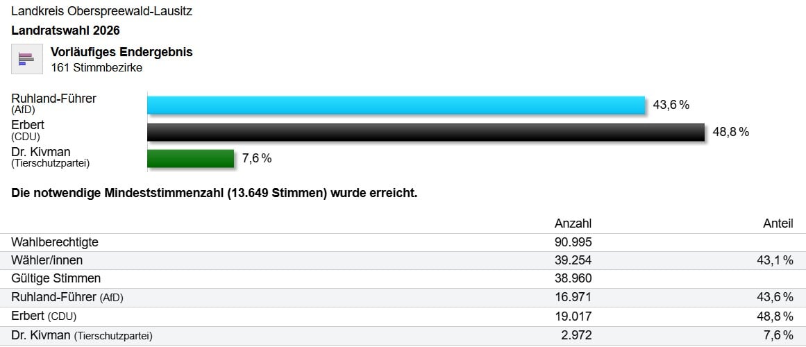 Nach der Landratswahl im Landkreis Oberspreewald-Lausitz am gestrigen Sonntag (->> wie berichtet) kommt es zu einer Stichwahl zwischen Alexander Erbert (CDU) und Antje Ruhland-Führer (AfD). Da im ersten Wahlgang kein Kandidat die erforderliche Mehrheit von 50 Prozent erreichte, entscheidet die Stichwahl am Sonntag, 25. Januar 2026, über das Amt der Landrätin beziehungsweise des Landrates.