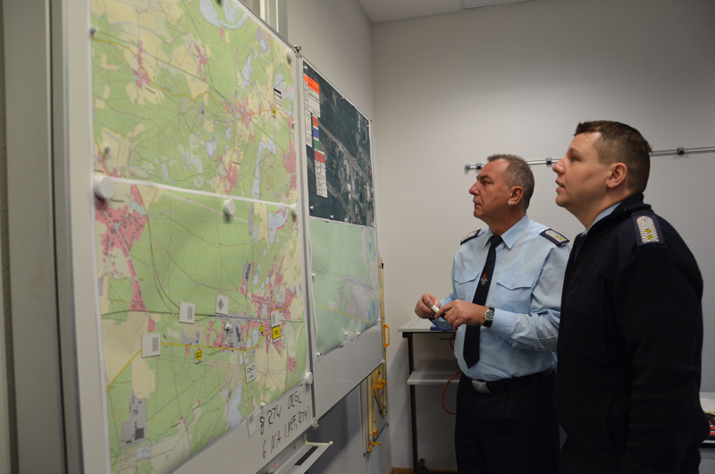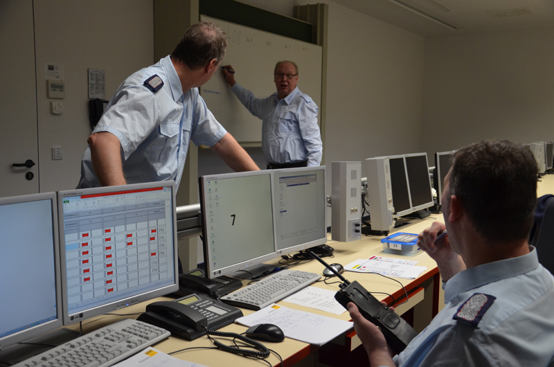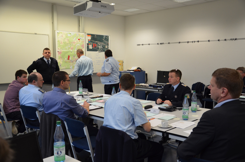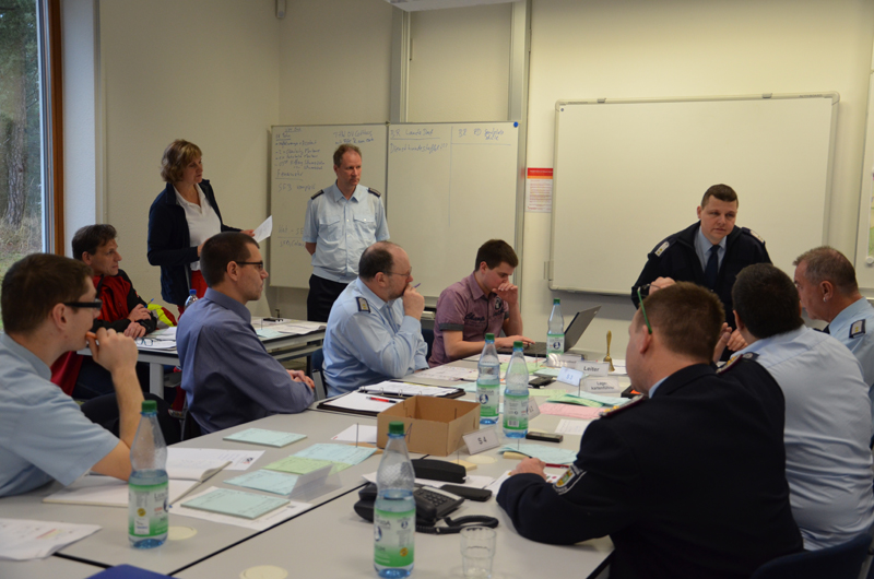 Die Wochenendfortbildung, bestehend aus einem Theorieteil am Freitag, der praktischen Ausbildung am Samstag und anschließender Auswertung am Sonntag, spielte sich in den Räumlichkeiten der Landesschule und Technischen Einrichtung für Brand- und Katastrophenschutz in Eisenhüttenstadt ab. Praktisch trainiert wurde in zwei Durchgängen: Während Gruppe Eins die Arbeit in der TEL aufnahm, spielten die übrigen Teilnehmer von einem anderen Raum aus Meldungen -beispielsweise von Polizei, Notarzt oder Bahn- laut Drehbuch ein. Im Anschluss wurden die Rollen getauscht. Um eine möglichst reale Ausgangslage zu schaffen, blieb der Inhalt des Drehbuchs für die Beteiligten bis zuletzt geheim.
