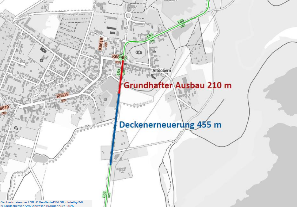 Wie der Landesbetrieb Straßenwesen Brandenburg mitteilt, beginnen am Montag, den 9. März 2026, die Bauarbeiten zur grundhaften Sanierung der L 53 in Altdöbern im Landkreis Oberspreewald-Lausitz. Die Baustrecke umfasst rund 650 Meter im Bereich der Senftenberger Straße. Die Arbeiten sollen voraussichtlich bis Ende September 2026 abgeschlossen sein.