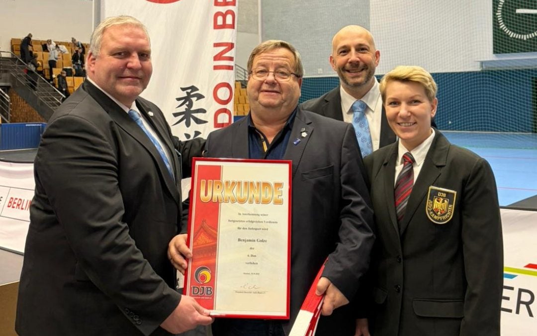 Der Deutsche Judobund hat Benjamin Golze vom KSC ASAHI im Rahmen der Nordostdeutschen Meisterschaften in Berlin mit dem 6. Dan ausgezeichnet. Golze ist seit über 50 Jahren im Judo aktiv, wurde früh Trainer und Bezirksauswahltrainer und leitet heute die Außenstelle in Calau. Als Kampfrichter war er national und international im Einsatz, unter anderem bei Europa-Cups und Turnieren in mehreren europäischen Ländern, und erhielt bereits den Titel „Honorary Continental Referee“. Auch nach seinem Abschied als Bundeskampfrichter 2023 ist er weiterhin in organisatorischer Verantwortung bei hochrangigen Veranstaltungen tätig. Der Verein und Judoka aus Brandenburg gratulieren ihm zu der Ehrung.