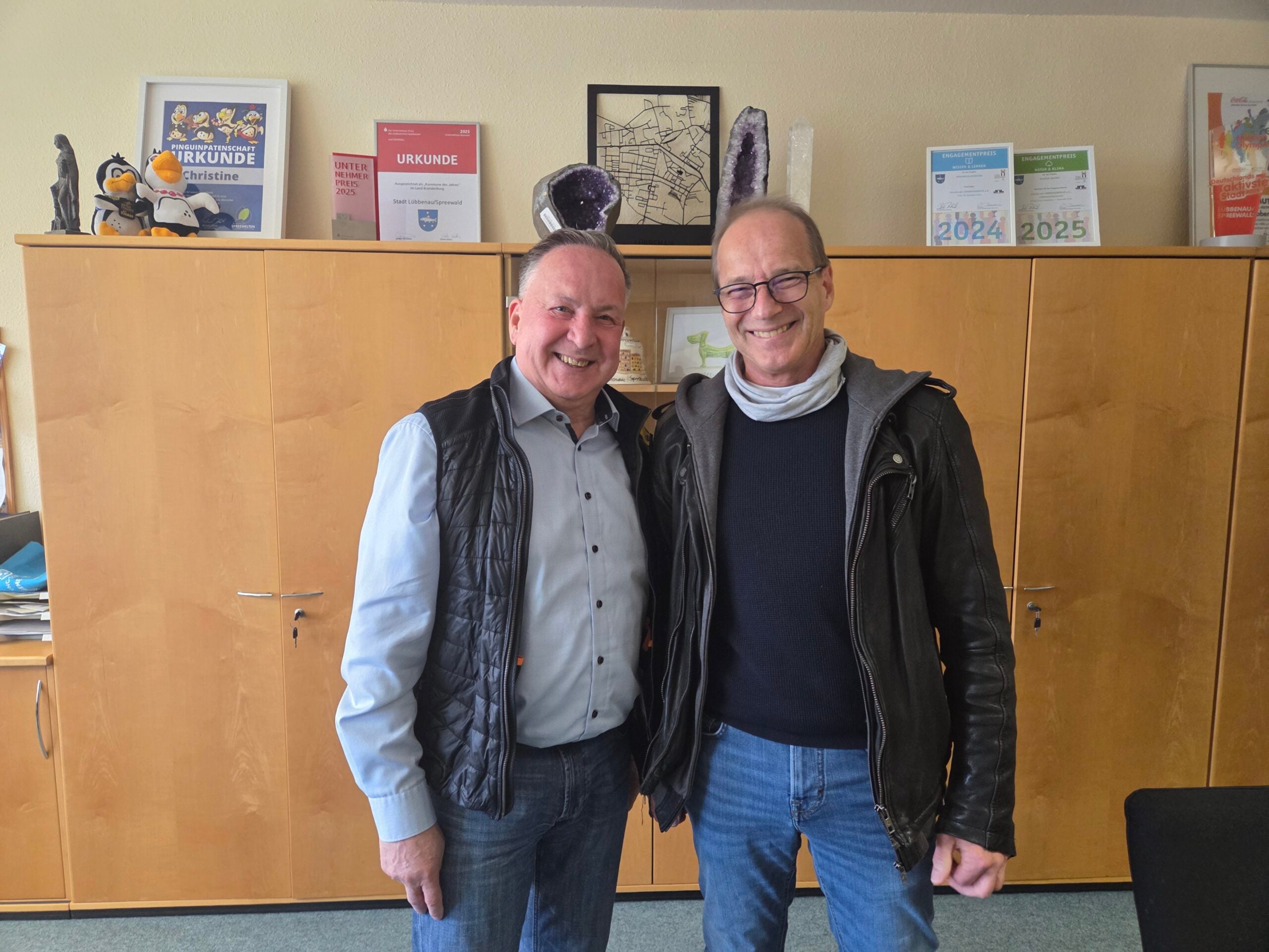 Bürgermeister Helmut Wenzel (l.) dankt Produzent Wolfgang Esser für sein jahrelanges Wirken in der Region (Bild: Stadt Lübbenau/Spreewald/ Anja Brautschek-Hofmann)