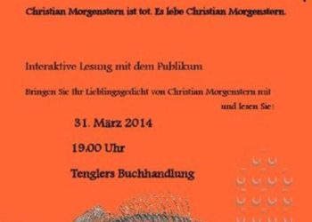 Montag, 31. März 201419:00 UhrTenglers Buchhandlung am Senftenberger AltmarktCHRISTIAN MORGENSTERN IST TOT. ES LEBE CHRISTIAN MORGENSTERN.Ein Programm der Lyrikerin Yana...