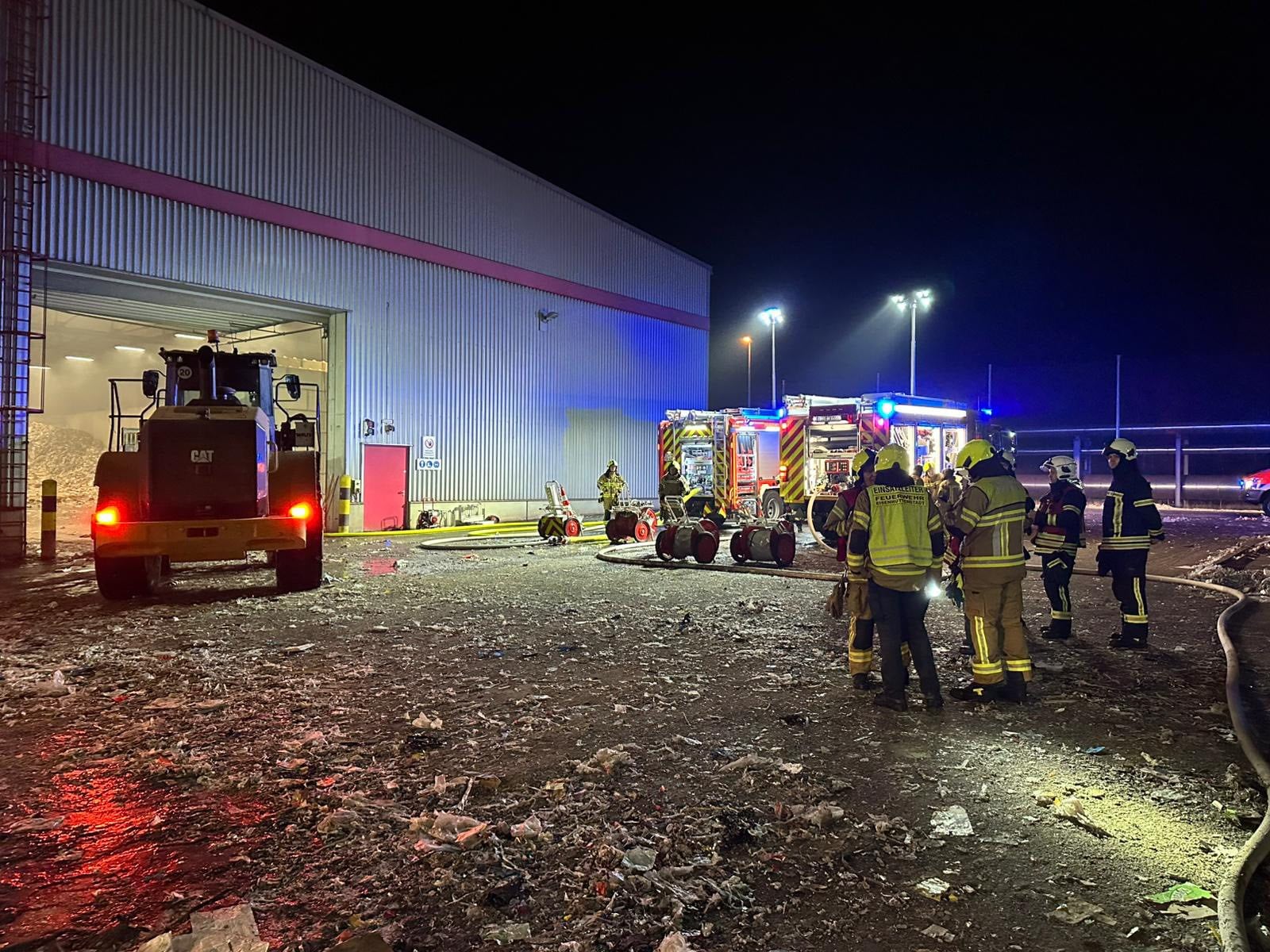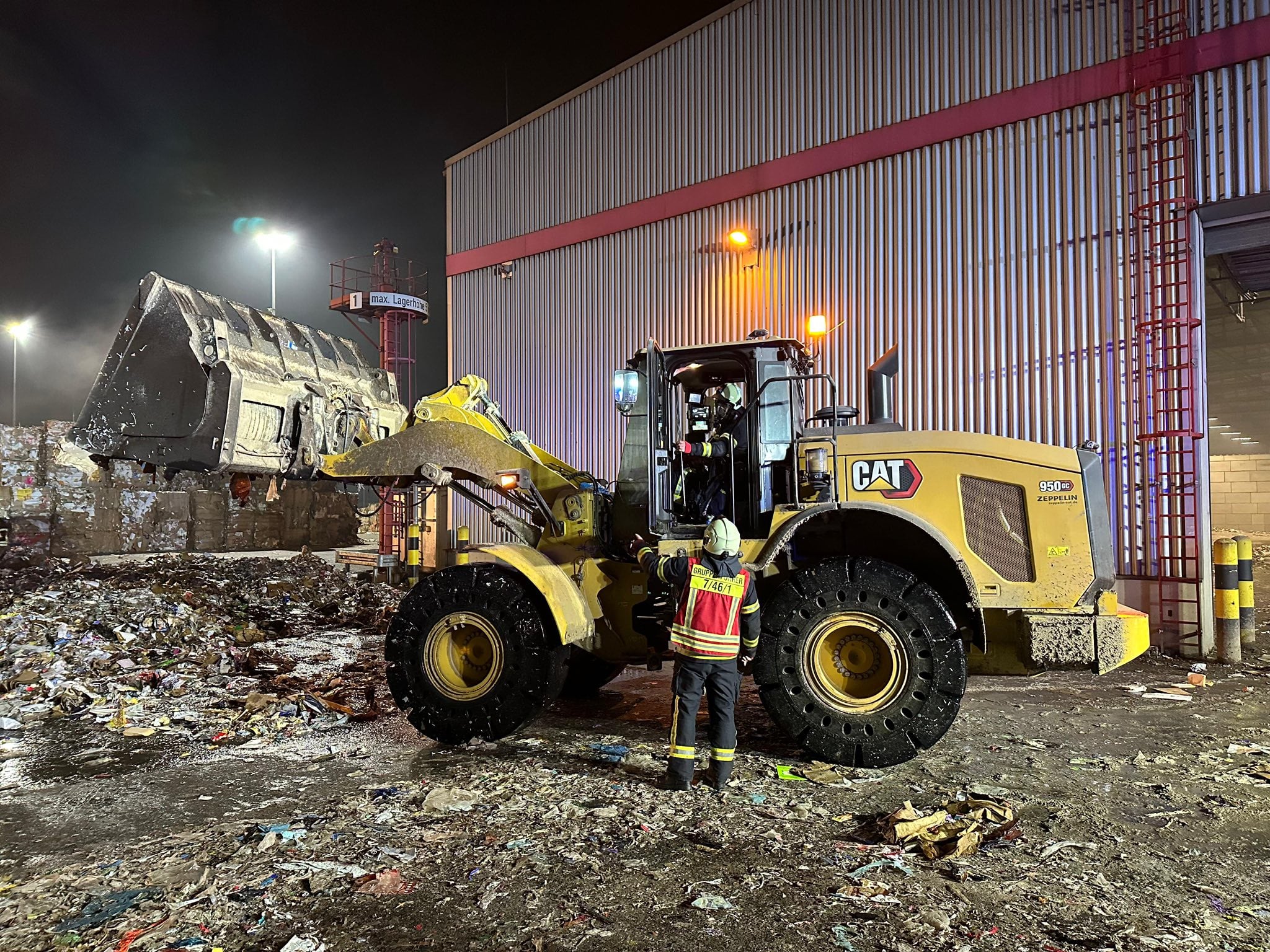 Im weiteren Verlauf des Einsatzes zeigte die Vornahme von zwei C-Rohren im Innenangriff sowie die Schaffung von Ablüftöffnungen Wirkung. Mit einem Radlader des Unternehmens mussten große Teile des Brandguts aus dem Haufen entnommen und ins Freie gebracht werden. Dort wurde das Material durch weitere Einsatzkräfte abgelöscht. Insgesamt wurden dabei rund 50 Kubikmeter Papier bewegt und gelöscht.