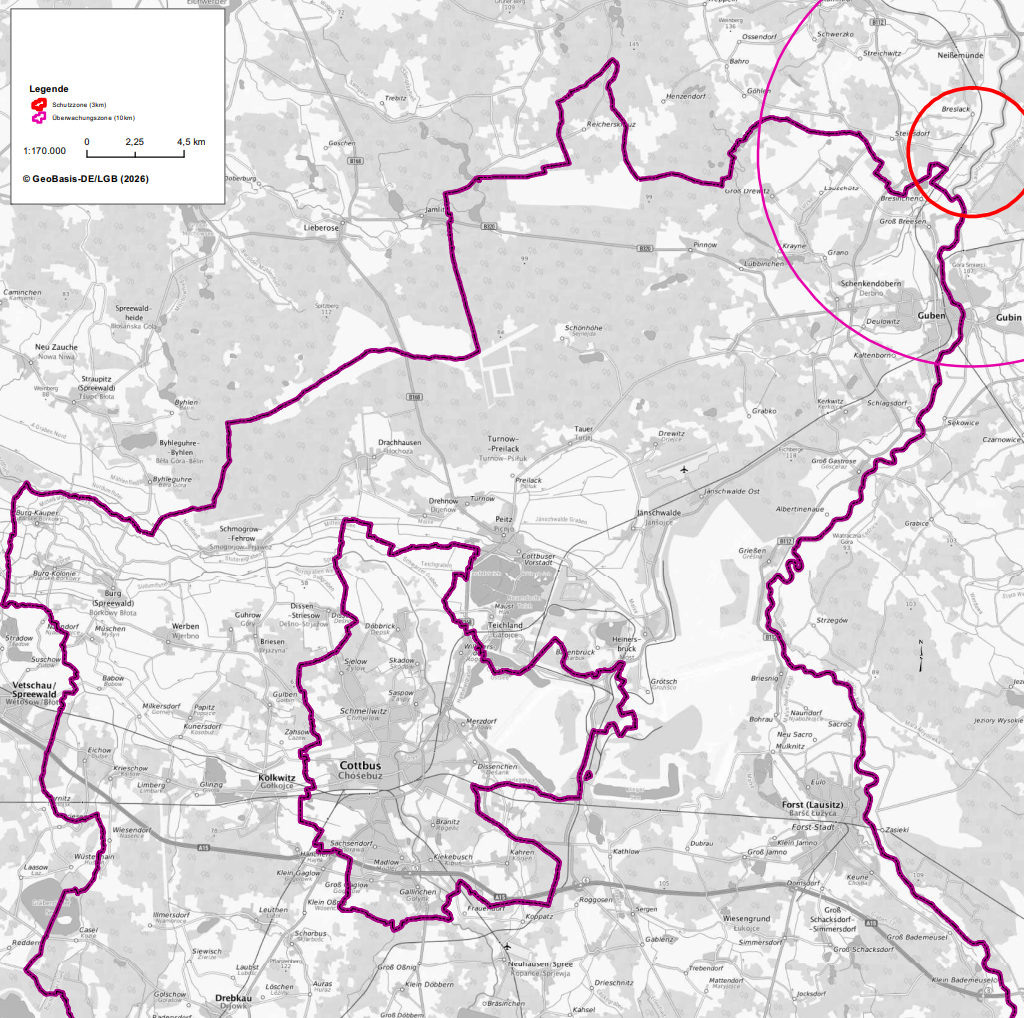 Die Schutzzone wird von einer Überwachungszone mit einem Radius von zehn Kilometern umgeben. In dieser Überwachungszone liegen anteilig die im Landkreis Spree-Neiße befindlichen Gemarkungen Sembten, Groß Drewitz, Lauschütz, Krayne, Grano und Schenkendöbern sowie die Gemarkung Deulowitz.