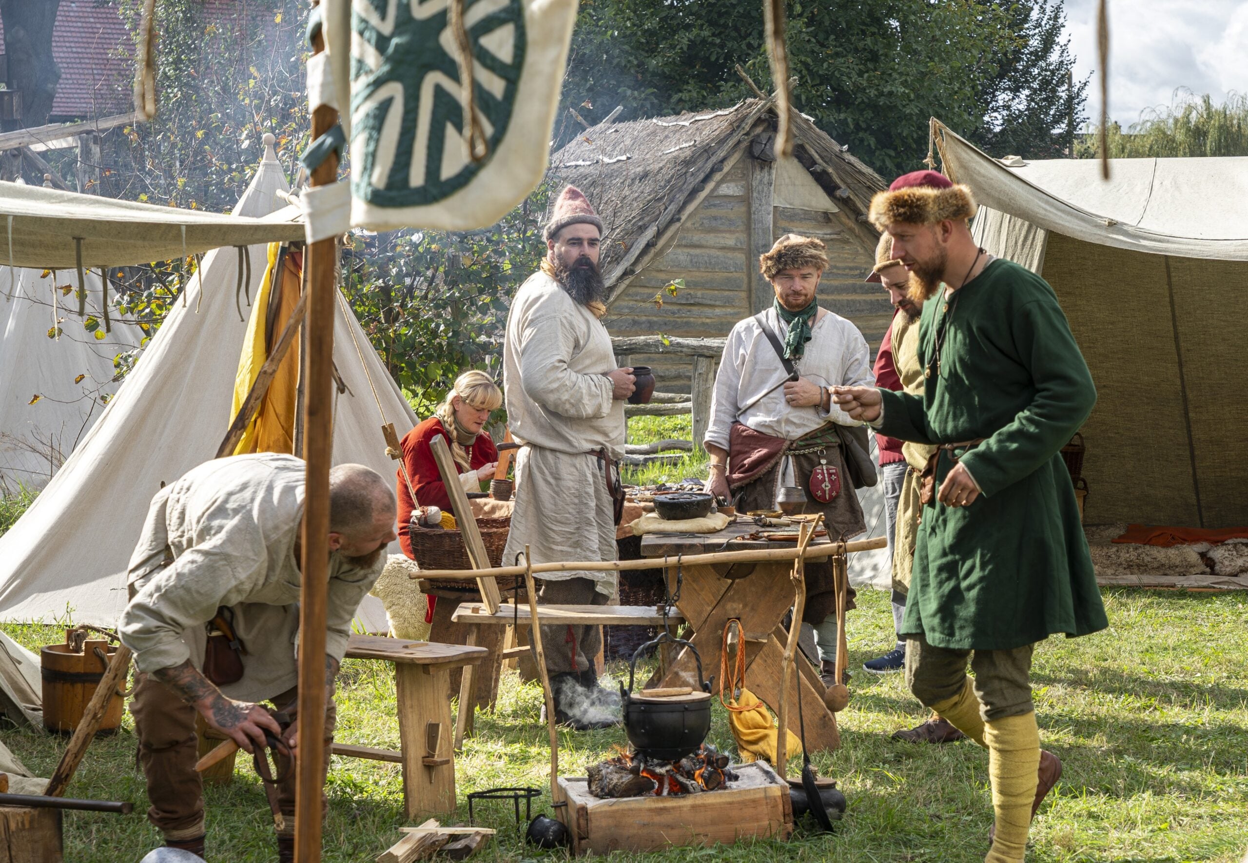 Zum Auftakt sind verschiedene Darstellerinnen und Darsteller vor Ort, die das Leben im frühen Mittelalter nachstellen. Sie verkörpern unter anderem Slawen, Wikinger und Franken. Inmitten der historischen Kulisse entsteht so ein lebendiges Bild des damaligen Alltags. Über offenen Feuerstellen wird gekocht, während gleichzeitig handwerkliche Tätigkeiten wie das Spinnen und Färben von Wolle demonstriert werden.