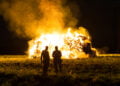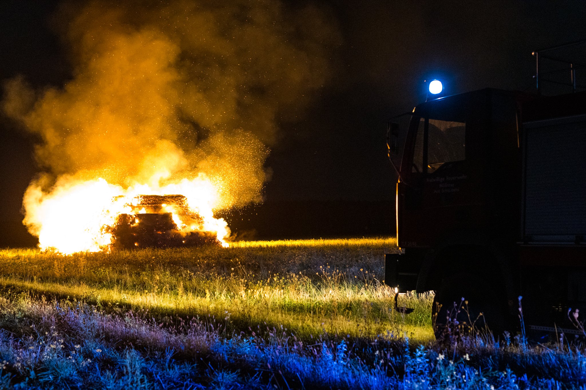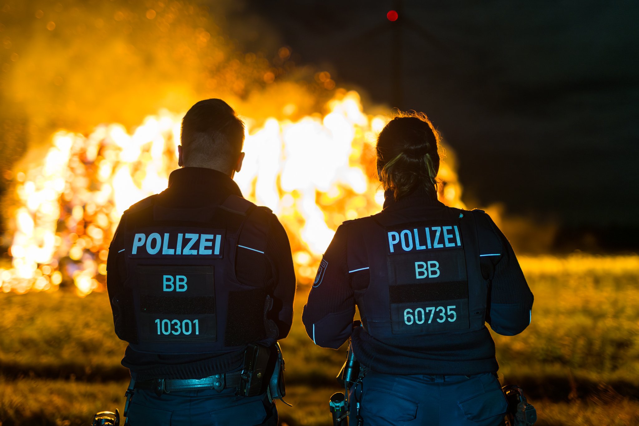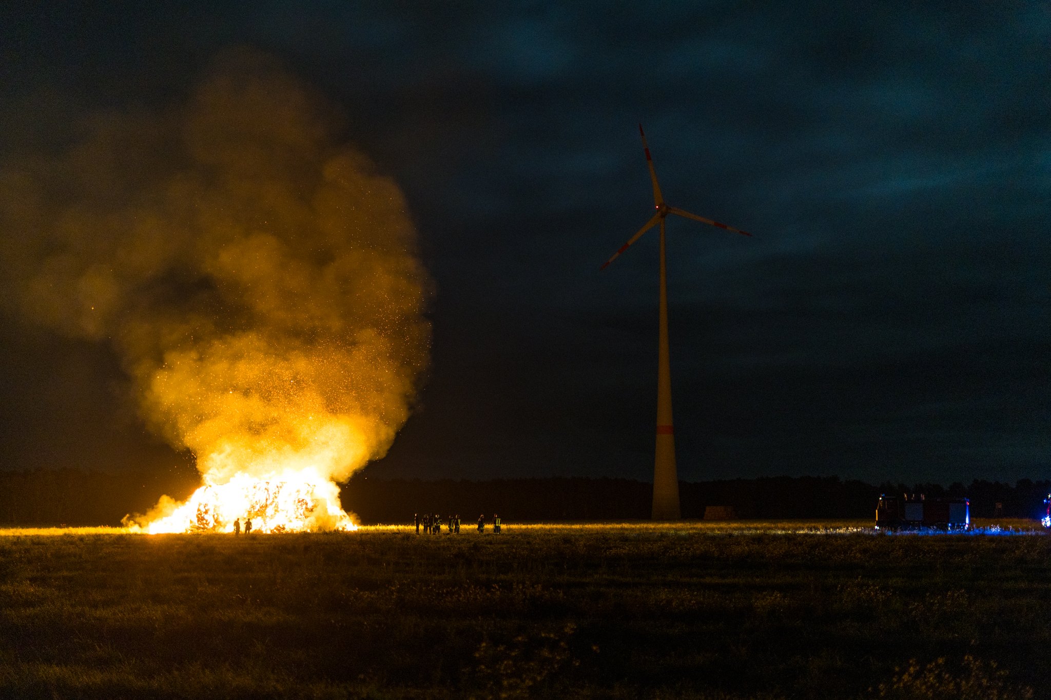 In Groß Schacksdorf-Simmersdorf rückten am späten Montagabend die Feuerwehren aus, nachdem gegen 22:30 Uhr ein Feuerschein auf einem Feld gemeldet wurde. Vor Ort brannte eine große Strohmiete lichterloh und musste kontrolliert abbrennen. Der Verdacht auf Brandstiftung liegt nach Angaben von Blaulichtreport Lausitz nahe. Noch in der Nacht suchten Landes- und Bundespolizei mit zahlreichen Kräften die Umgebung nach möglichen Verdächtigen ab, während die Flammen über mehrere Stunden loderten.