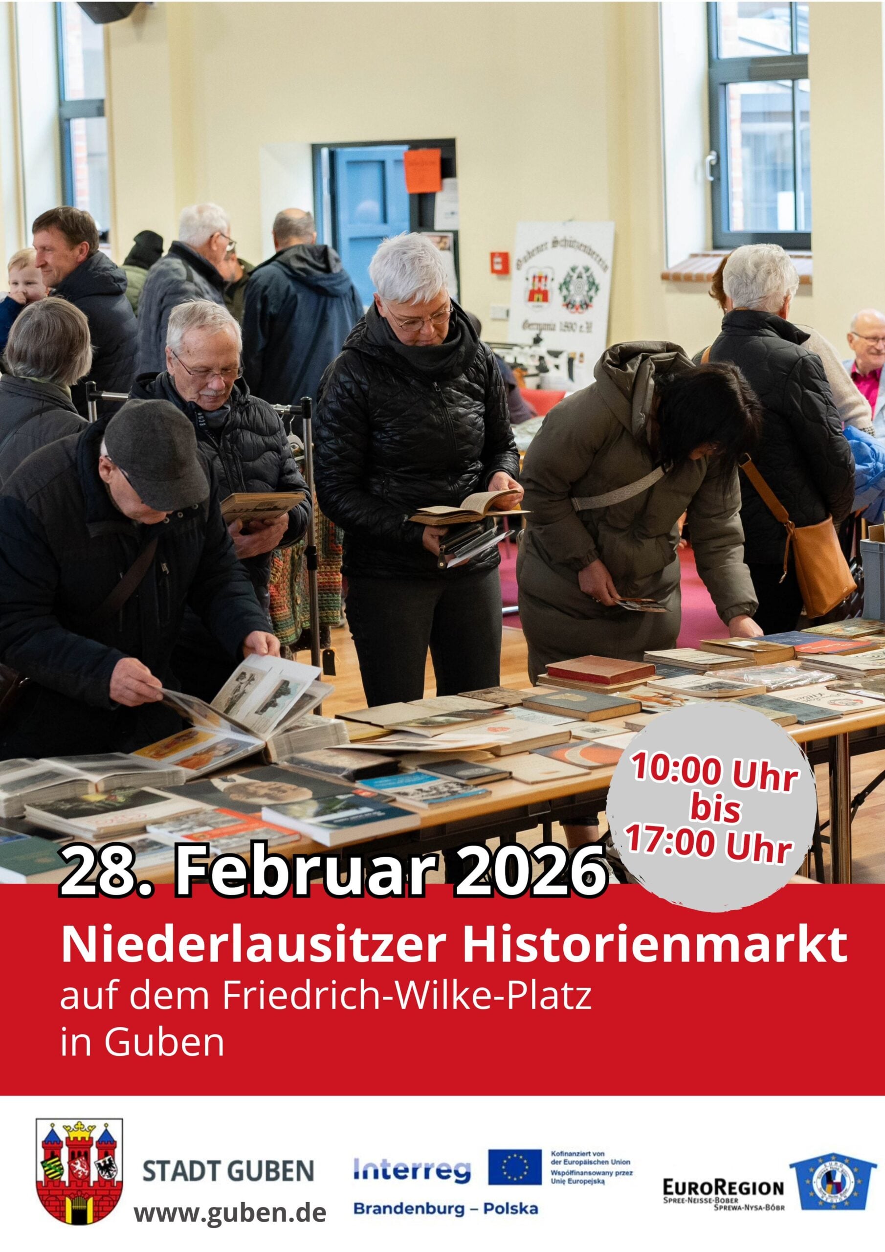 Am Samstag, dem 28. Februar 2026, veranstaltet die Stadt Guben den Niederlausitzer Historienmarkt. Austragungsorte sind die Alte Färberei sowie der angrenzende Ausstellungsraum. Besucherinnen und Besucher können sich zwischen 10:00 Uhr und 17:00 Uhr über ein breit gefächertes Angebot mit historischem Schwerpunkt informieren.