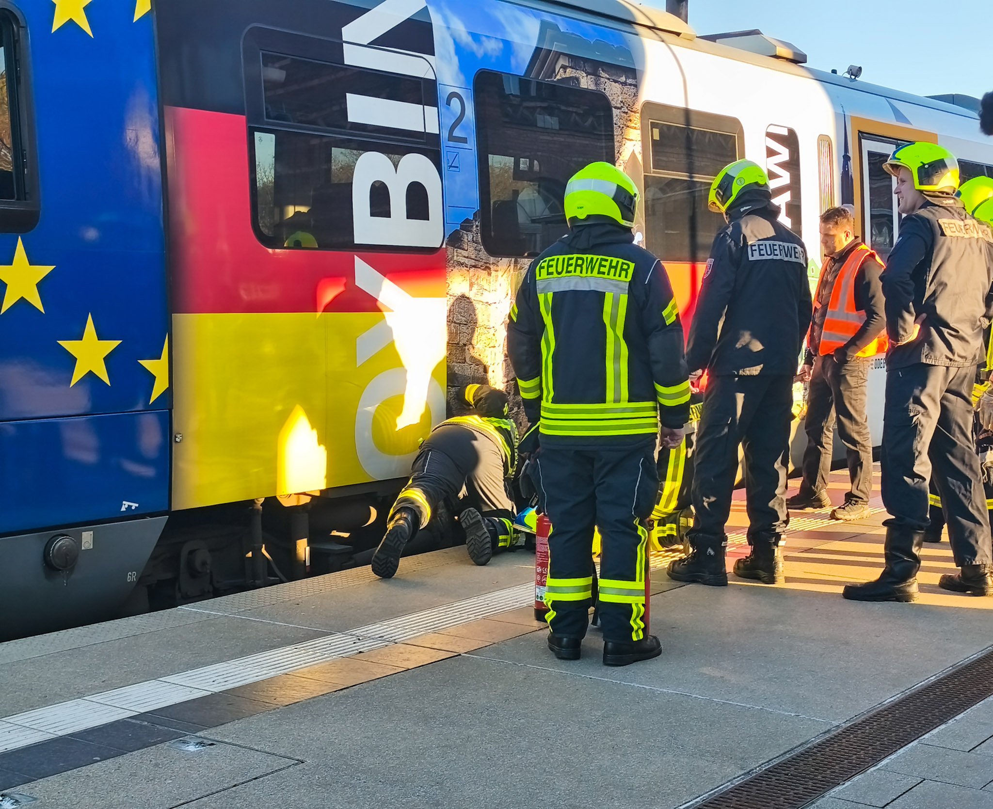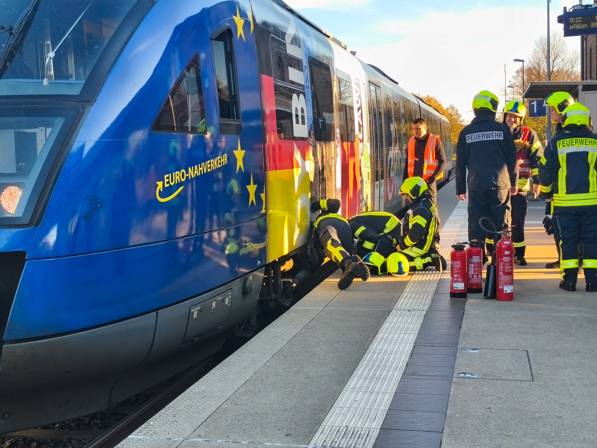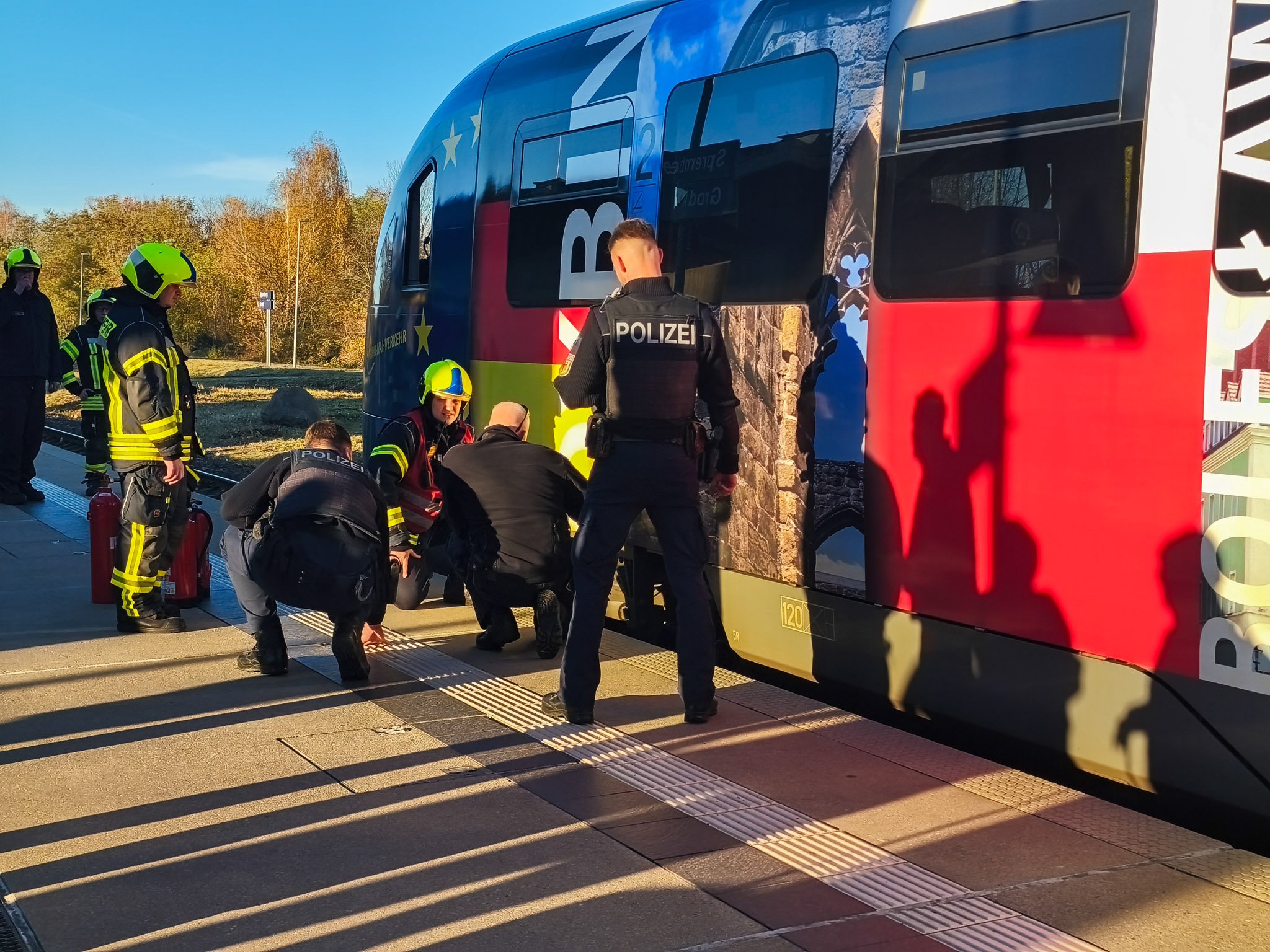 Am Bahnhof in Spremberg kam es heute Nachmittag zu einem Einsatz von Feuerwehr, Rettungsdienst und Bundespolizei. Wie Blaulichtreport Lausitz von vor Ort berichtete, war an einem einfahrenden Zug eine starke Rauchentwicklung festgestellt worden. Das Zugpersonal reagierte umgehend und leitete die Evakuierung aller Fahrgäste ein. Der Zugführer hatte bereits vor dem Eintreffen der Feuerwehr versucht, die Situation mit einem Feuerlöscher unter Kontrolle zu bringen.