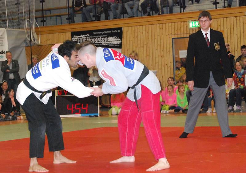Seit sechs Jahren war der KSC ASAHI Spremberg zu Hause ungeschlagen und wollte diese Jahre natürlich fortsetzen. Mit dem 1. JC Mönchengladbach kam aber einer der Titelfavoriten nach Spremberg. Die Verantwortlichen sprachen schon im Vorfeld von einer ganz engen Kiste. Diese wurde es dann auch. Der wiedergenesene Danni Tempel holte nach nur einer Minute den ersten Punkt für Spremberg. Nach drei Niederlagen in Folge standen die Spremberger schon mit dem Rücken zur Wand. Doch Sebastian Bähr, Kapitän Stefan Niesecke und Neuzugang Nils Dochow sorgten mit Ihren Siegen für eine 4:3 Halbzeitführung. Während in der Halbzeitpause die Zumba Kids von ASAHI ihren ersten großen Auftritt hatten, qualmten bei den ASAHI Trainern die Köpfe. Drei Kämpfer müssen ausgetauscht werden, so schreibt es das Reglement vor. Am Ende konnte nur einer der drei Neuen gewinnen obwohl es doch gar nicht schlecht aussah. Hannes Vetter baute die Führung auf 5:3 aus. Doch wie schon in Runde eins, verloren die ASAHI Kämpfer drei Begegnungen in Folge. Gregg Varey hatte aber auch mit dem Iraner und ehemaligen Fünften der Weltmeisterschaften einen ganz dicken Brocken auf der Matte und Punktgarant Kevin Schuchardt verlor zum zweiten Mal gegen den Deutschen Juniorenmeister Marcel Bizon.