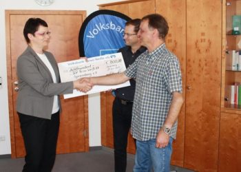 Heike Krenitz-Fleischer, Teamleiterin der Volksbank Spree-Neiße eG in Spremberg übergab einen Scheck in Höhe von 800,00 € an Matthias Koch...
