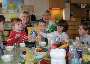 Um den quadratischen, niedrigen Tisch verteilt sitzen die 10 Kinder des Öko-Kinderhaus Bummi aus Lauchhammer ganz gespannt als Nicole Nitschke...