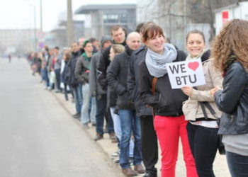 Cottbus Ersten Stich gesetzt. Menschenkette zum Erhalt der BTU Cottbus und HS Lausitz mit mehr als 1.000 Teilnehmern 10. April 2013
