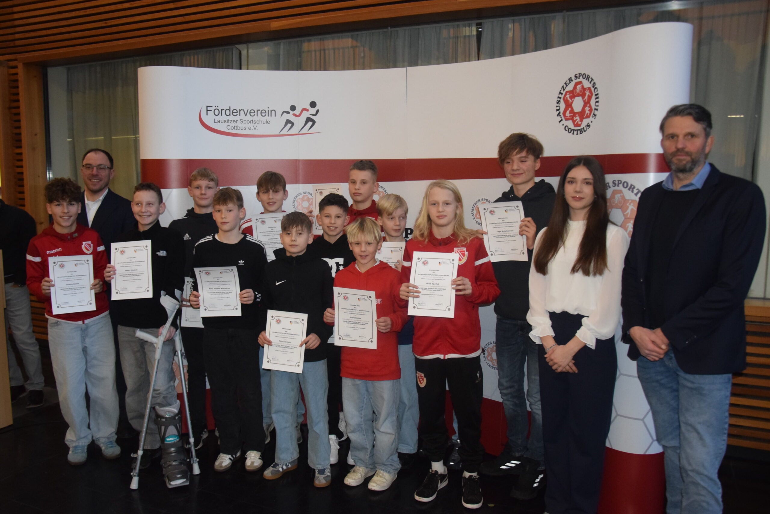 Direkt vor dem Beginn der Winterferien wurden 58 talentierte Sechstklässler mit ihren Eltern in die Lausitzer Sportschule Cottbus geladen. Ihre sportlichen Grundlagen haben die Talente in ihren Vereinen daheim gelegt. Dazu wurde den Talenten, wie beispielsweise den zwölf Schülerinnen und Schülern der Fußballklasse (Foto) die Urkunden mit der sportlichen Empfehlung diese Schule zu besuchen, überreicht.